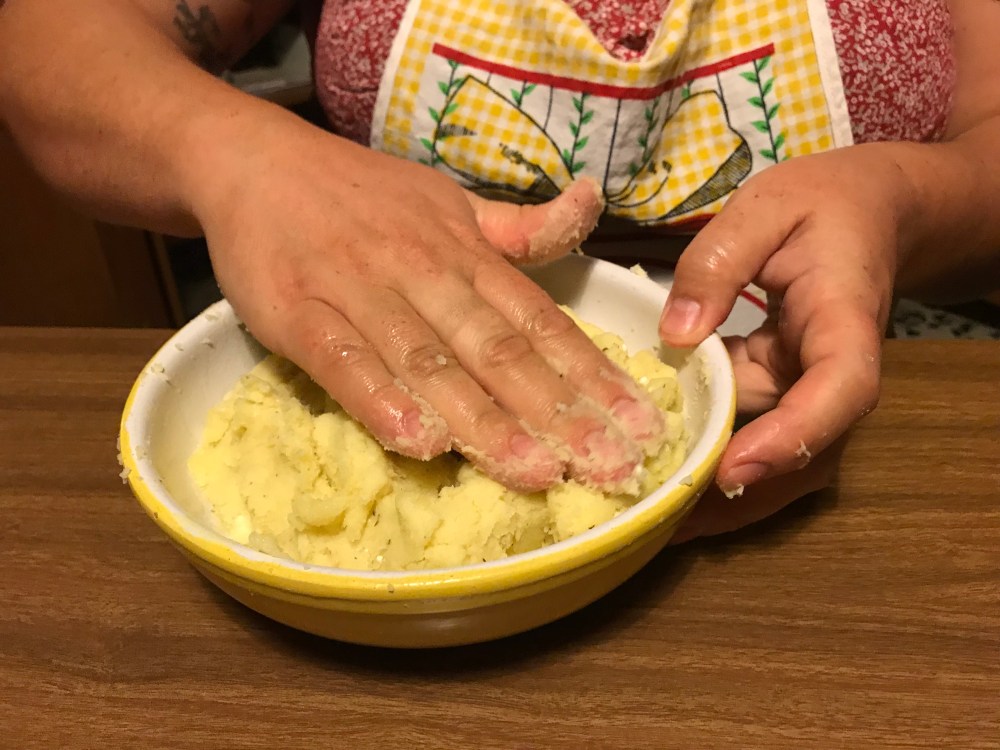 Rulof and I each had our own bowl of cooked mashed potatoes and we slowly mixed and blended, while constantly tasting. When we were done, we tasted each other’s mixes and mine had much stronger flavors of the cheeses, garlic, and mint, perhaps even too strong. We combined our mixtures and then went back to work on the dough.
