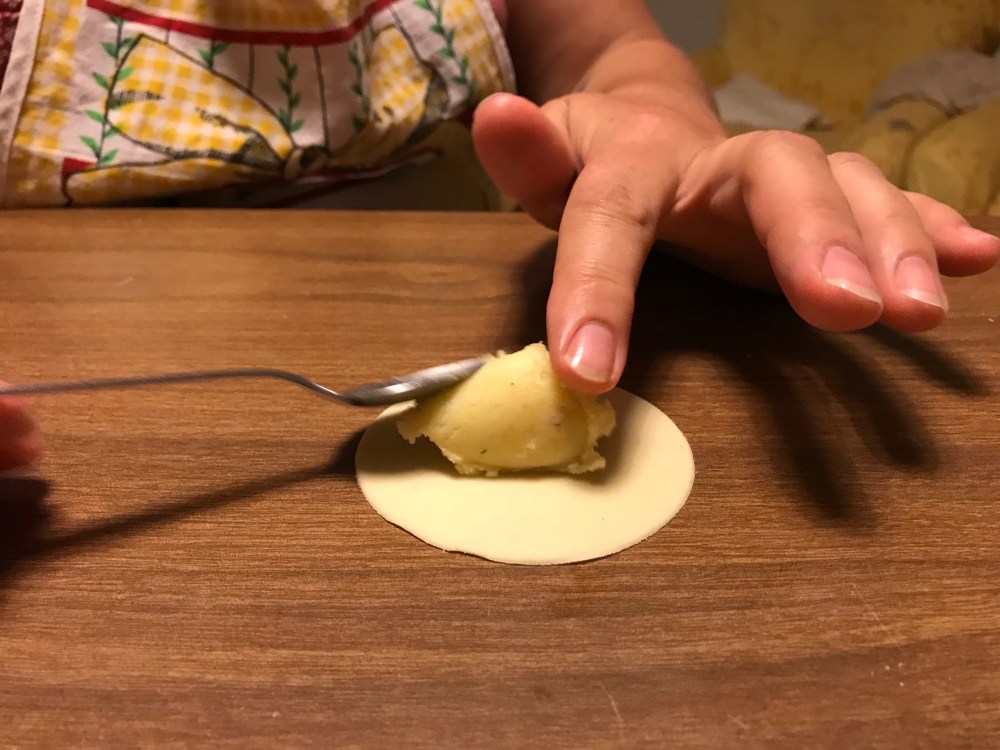 We used cleaned tin cans to cut circles out of the dough, then put a heaping teaspoon of the potato mixture into the center. And then we pinched the dough closed into a decorative teardrop shape.