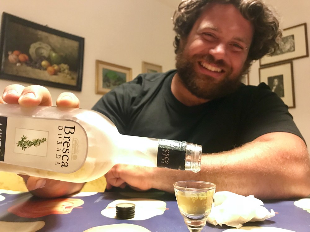 He served the saedas with mirto, which is easily my favorite liqueur of all. I’ve had and loved the Corsican French version (myrte) and on this trip, I made it a point to drink Sardinian mirto at every opportunity. It’s a sweet, peppery, herbal liqueur – with hints of gin and tropical flowers. To me, it also tastes like mountain forests and wind from the sea. It’s made from a berry that grows everywhere in Sardinia and Corsica, and a few other Mediterranean regions. I was so pleased when Damiano brought out a bottle of it to have with dessert!