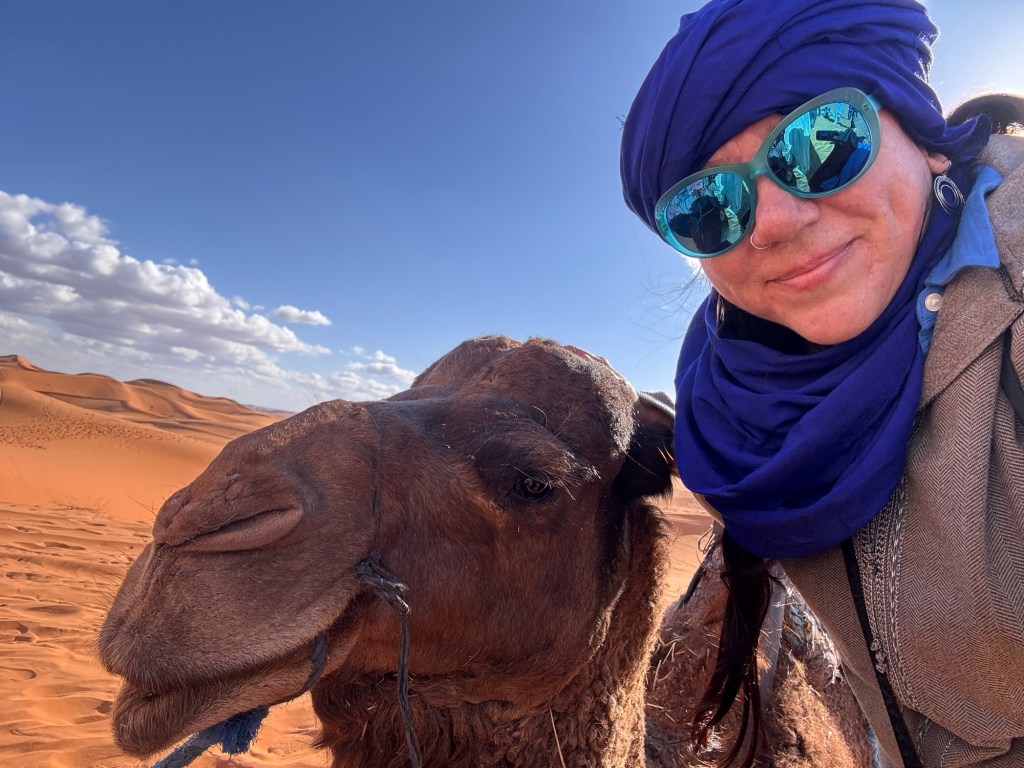 From Ait Ben Haddou, we continued by bus to the Sahara Desert. There, we celebrated New Year’s Eve in the most magical way imaginable. We rode camels into the dunes, where the golden sands stretched endlessly beneath the brilliant clear blue sky. That night, Mary Beth and I lay flat in the cool sand, staring up at a canopy of stars so bright and clear it felt like we could reach out and touch them.